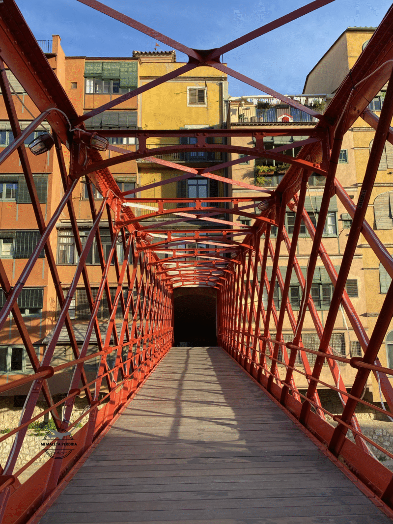 Después de este paseo entre la calle Argenteria y La Rambla, cruzaremos el Pont de les Peixeteries Velles (traducido Antiguas Pescaderías) o conocido también como el Pont de Ferro (puente de hierro) o Eiffel. Desde este puente diseñado por Gustave Eiffel (creador de la Torre Eiffel) en 1876, tienes unas vistas fantásticas a las casas del río Onyar con la catedral de fondo. Destaca por su color rojo intenso y al ser de metal, es uno de los más llamativos y fotografiados de la ciudad. Su nombre hace referencia al antiguo mercado de pescados que se encontraba antiguamente en esa zona.
