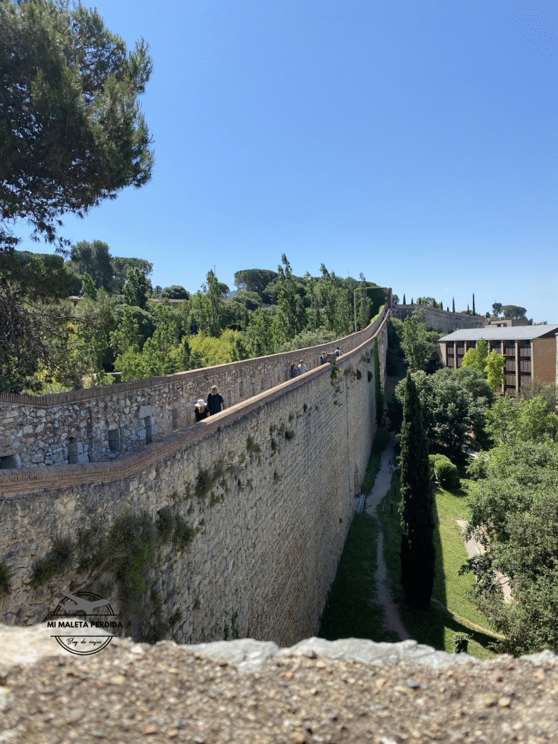 Ya que habrás subido a la parte alta de Girona, la ruta sigue paseando a lo largo de las murallas románicas, siguiendo las indicaciones que señalan la muralla como «Passeig Arqueològic«. La primera muralla fue construida en el siglo I a. C. y ampliadas en la época medieval. Hoy es un excelente mirador con vistas a la ciudad y sus alrededores. Si quieres dejar este paseo por más tarde, puedes hacerlo durante el atardecer, te aseguro que es uno de los mejores momentos del día.