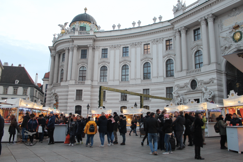 Por otro lado, situado frente a una de las entradas principales al Palacio Hofburg se encuentra el conocido mercado de navidad de Hofburg. En la fachada norte del Palacio, donde se accede al Museo Sisi, a los Apartamentos y a la Escuela de Equitación, justo en esta plaza se encuentran los puestos del mercado de Navidad de Hofburg. Estos puestos nos ofrecen artesanía vienesa y diferentes decoraciones navideñas.