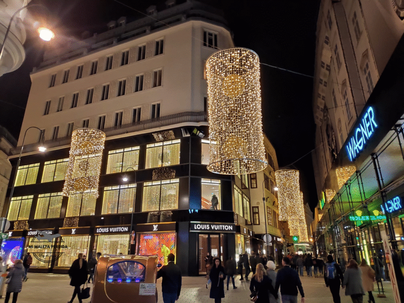Entre los lugares más impresionantes destaca la Kärntner Strasse, una de las principales calles comerciales, que se viste con cortinas de luces doradas y escaparates temáticos. Muy cerca, la Graben deslumbra con sus lámparas suspendidas creando una atmósfera muy sofisticada.